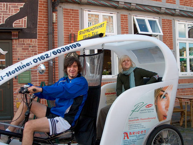 Wir fuhren mit diesem Fahrradtaxi durch Stade